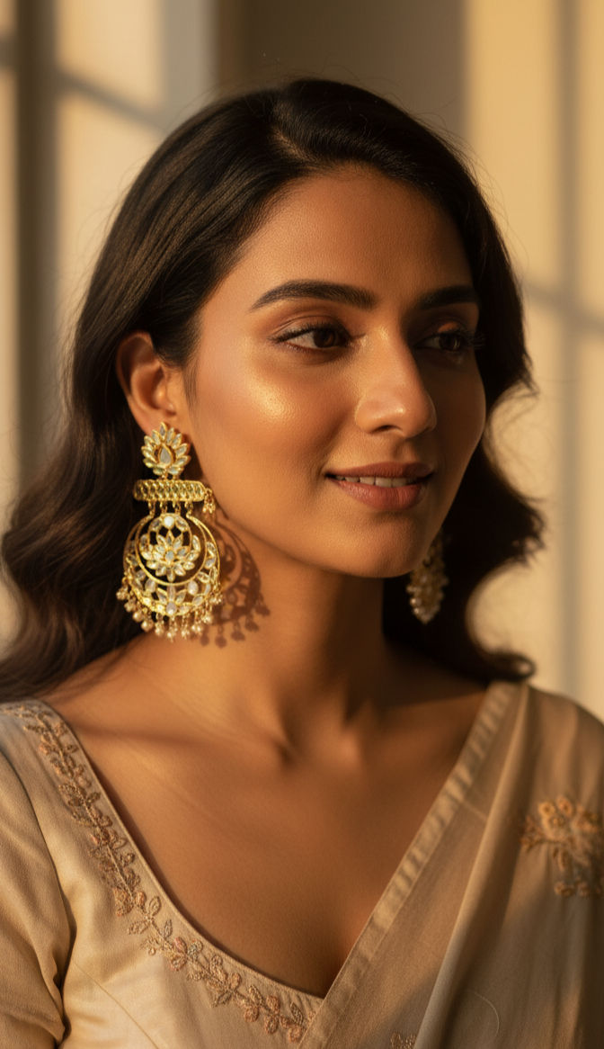 A royal blend of kundan mirror motifs and creamy pearls, this crescent-shaped chandbaali exudes elegance. The floral detailing enhances its handcrafted charm, making it ideal for weddings and grand celebrations.